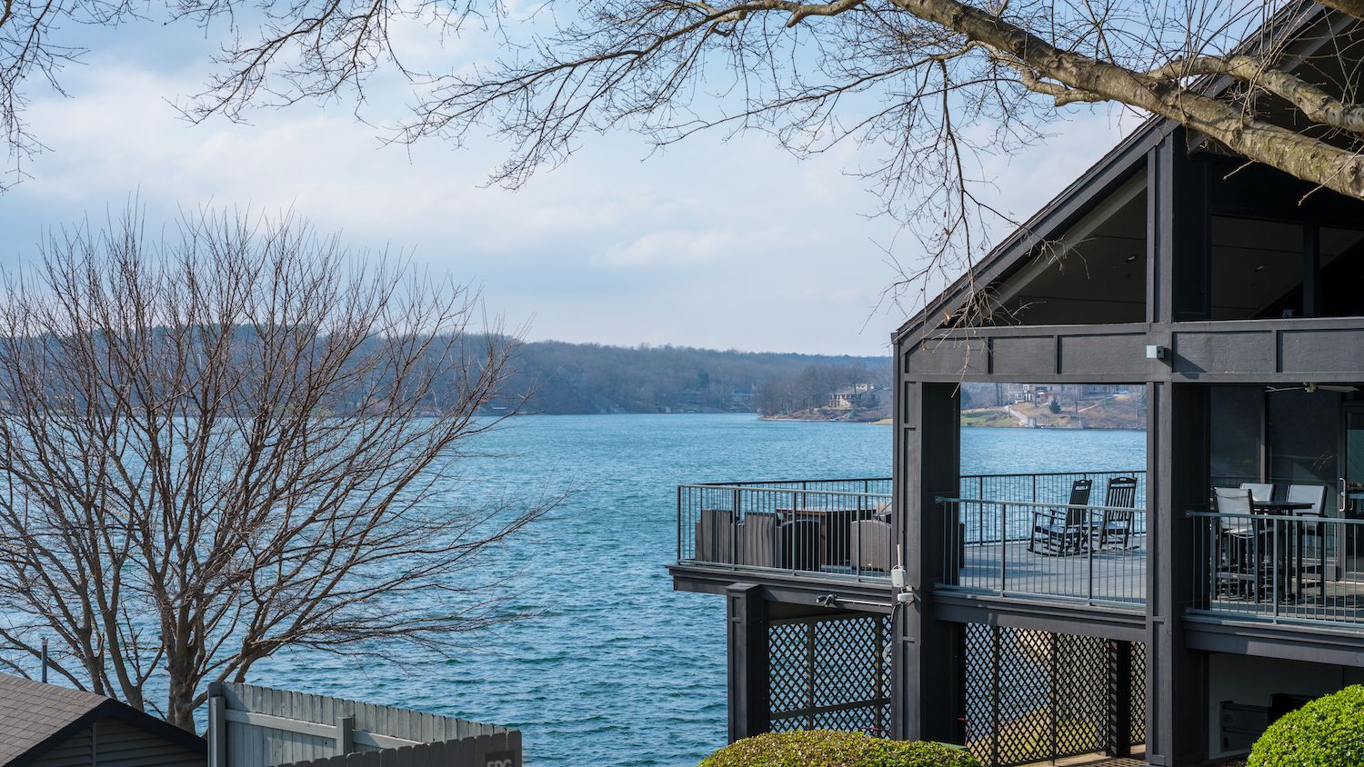 Multiple decks, a fire pit, and covered sitting places are included in the lakeside landscape and a private dock on the lake with canoes for your enjoyment.