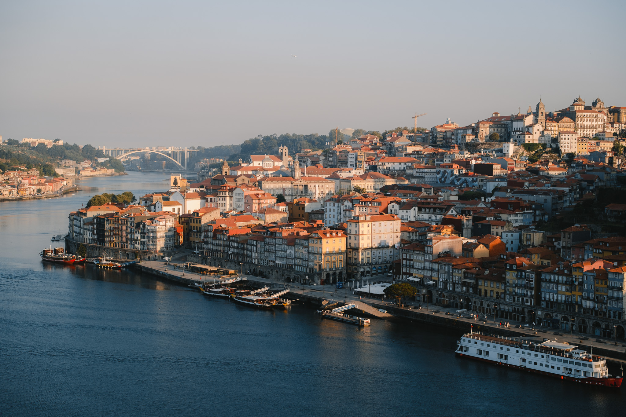 The golden hour casts a warm glow over the charming Ribeira district along the Douro River in Porto, showcasing the city’s picturesque terracotta rooftops and historic architecture.