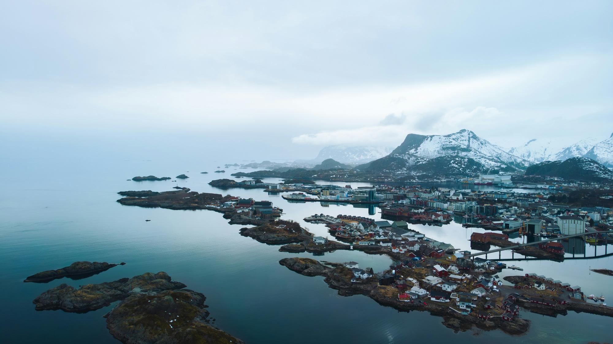 Overlooking the serene waters and scattered islands, this aerial shot captures the tranquil beauty of a small town nestled among the snowy peaks of Lofoten, Norway.